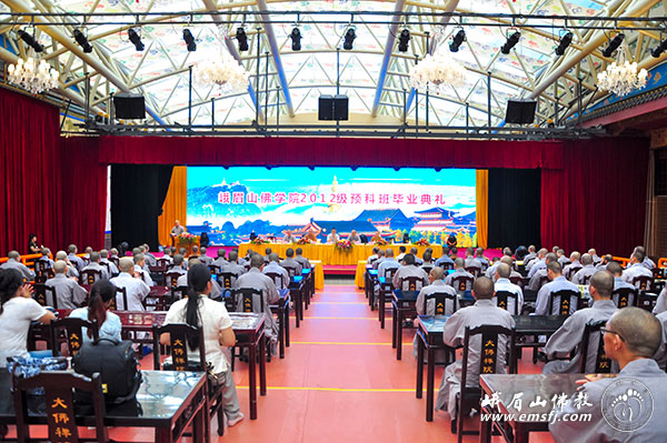 2014年7月12日,峨眉山佛学院2012级预科班毕业典礼在大佛禅院峨眉讲堂举行。参加毕业典礼的有四川省佛教协会秘书长、峨眉山佛学院副院长王立军,峨眉山佛学院副院长满霖法师、法源法师、隆藏法师,副教务长演妙法师以及全院师僧。典礼由法源法师主持。