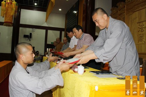 最后,由主席台上领导及大德长老为寒山书院第八届学僧颁发毕业证书,毕业学僧向母校赠送礼品,在悠扬、庄严的《三宝歌》声中,苏州寒山书院第八届学僧毕业典礼圆满结束。与会的法师、学僧分别与领导、大德长老在重元寺法堂前合影留念。