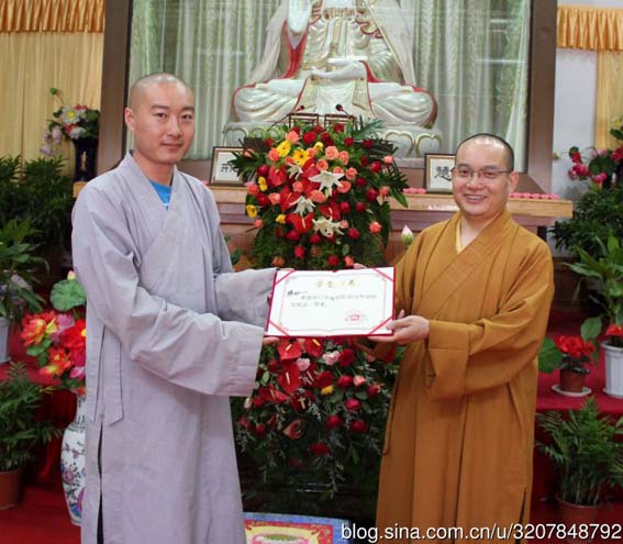 照如同学荣获一等奖,常务院长贤空法师颁发证书