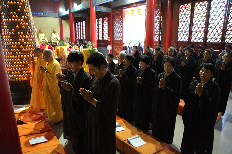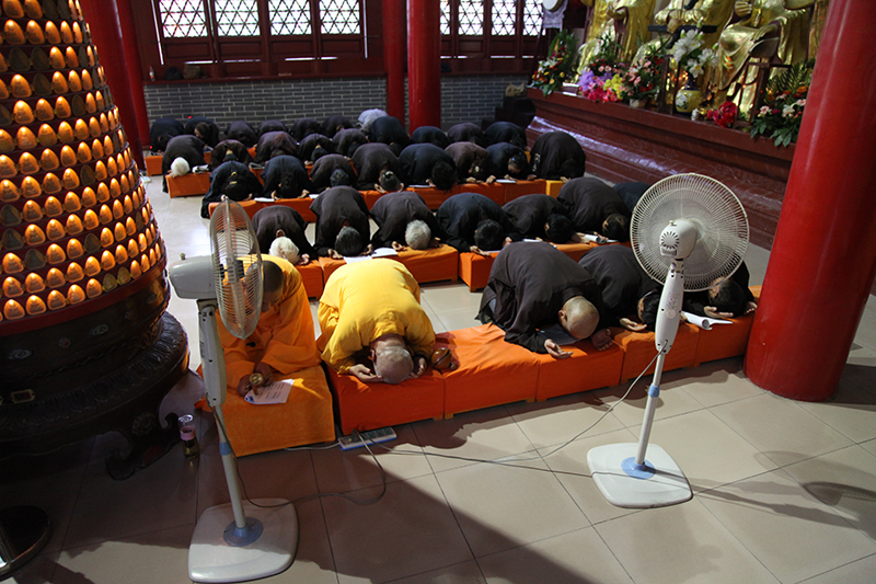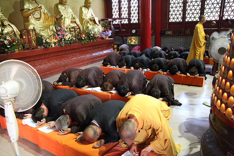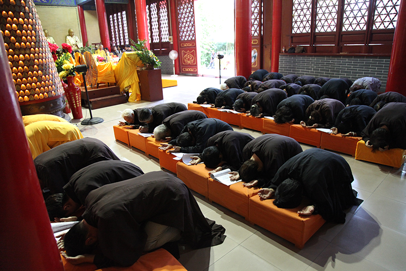 2014年7月16日,淄川普照寺举行居家菩萨戒仪轨。授戒程序依次为演礼、忏摩、请戒、正授、讲戒等。上图等为忏摩。