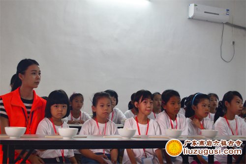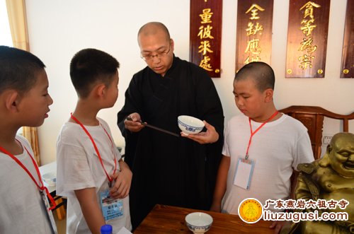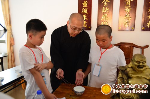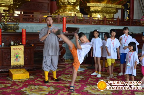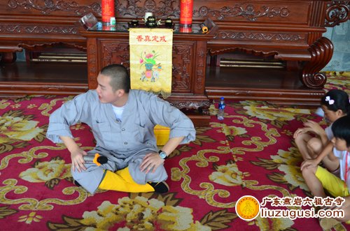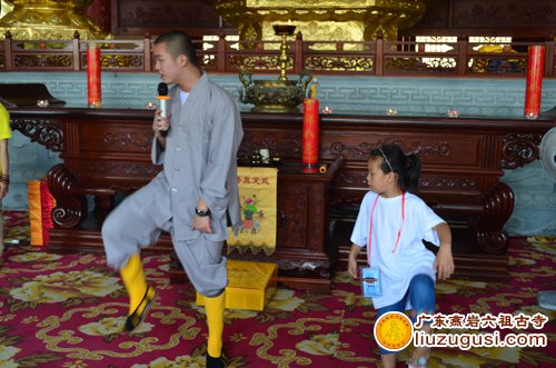 今天是夏令营正式上课的第一天法师耐心教小朋友学礼仪、武术、玩游戏。