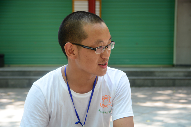 小刘同学来自广州,才17岁,他告诉我,拜佛有很大的加持力,虽然天气很热,但内心却是清凉的。来到东林寺,感觉心很清静,放松。在问到怎么看待因果与轮回的问题时,他说:“以前只是听说过,没有深入思考,但这次有机缘认真听师父讲解,因而对因果与轮回的道理,有了更深的理解与认同,非常受益。”
