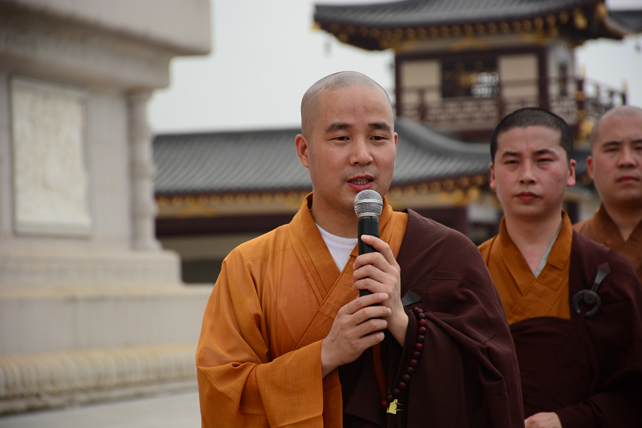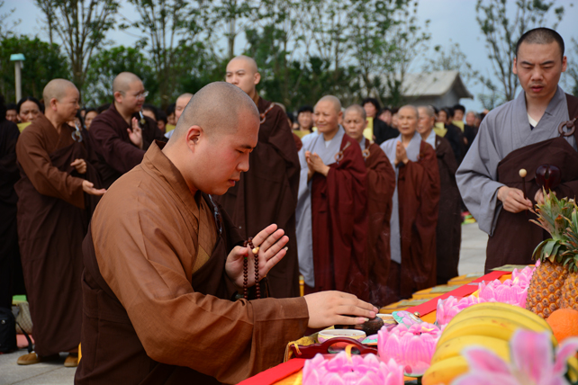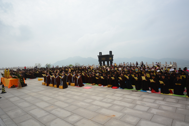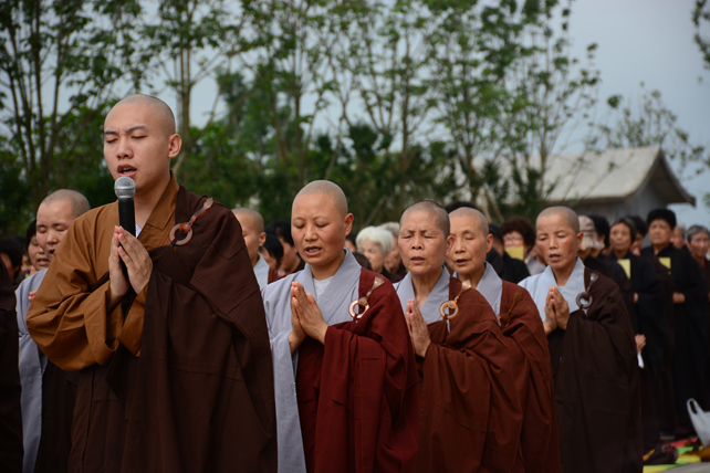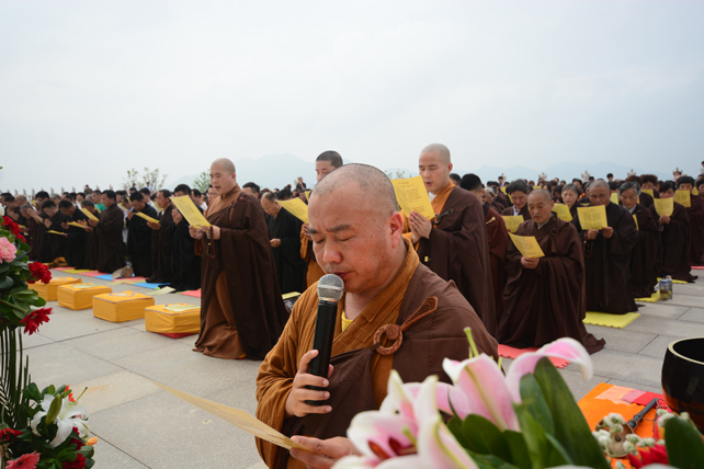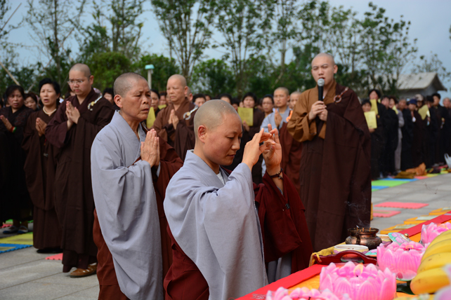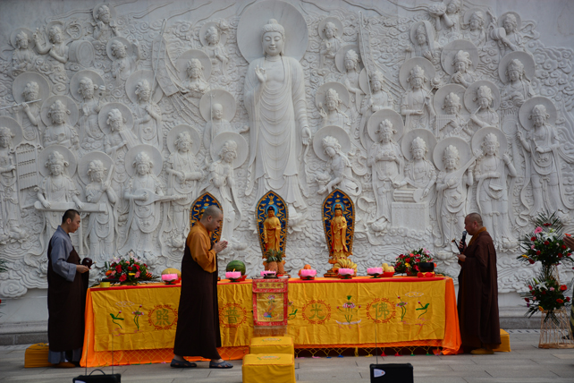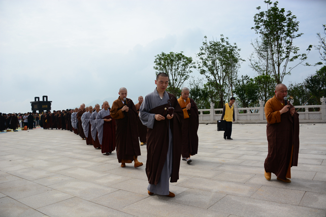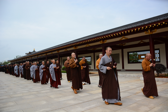 五百多位三宝弟子于大佛台前分东西班,肃然而立,法师们依次拈香。场面庄严而殊胜。众人依次唱念阿弥陀佛圣号,齐诵《佛说阿弥陀经》,唱颂《赞佛偈》,绕须弥台一周,长跪于佛像前回向发愿,祈愿尽虚空所有众生皆能吉祥安康、忆佛念佛、同登极乐。