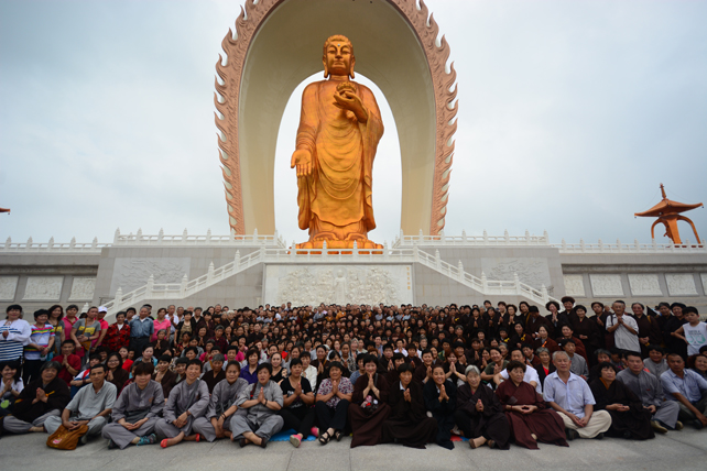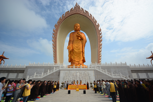 2014年6月29日清晨,阴雨多日的天空初绽丽阳,金色的阿弥陀佛圣像在蓝天白云的映衬下,显得格外地庄严相好。来自山东济宁、台儿庄、薛城、微山湖等地的缁白二众560人,在东林寺慈善护生会慧悦法师的带领下,来到东林寺净土苑朝礼大佛,并在大佛台前举行一场诵经祈福法会。