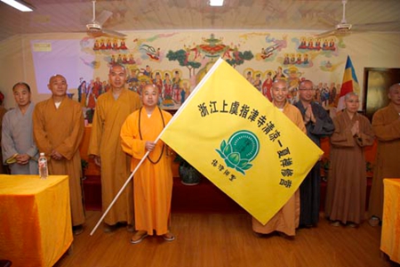 2014年7月10日上午,浙江省绍兴市上虞区指津寺指津讲堂以“清凉一夏”为主题的首届禅修夏令营开营式隆重举行。绍兴市佛教协会会长、炉峰禅寺方丈净芳法师代表市佛教协会向上虞区佛教协会副会长兼秘书长、上虞区指津寺监院永军法师授营旗,并在开营式上作慈悲开示。
