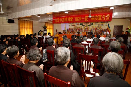 据了解,本期共有110位营员,来自上虞城乡各地,其中50位营员因日前赴普陀山朝拜时受台风影响滞留,未能及时赶回参加上午的开营式。
