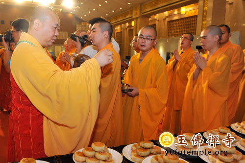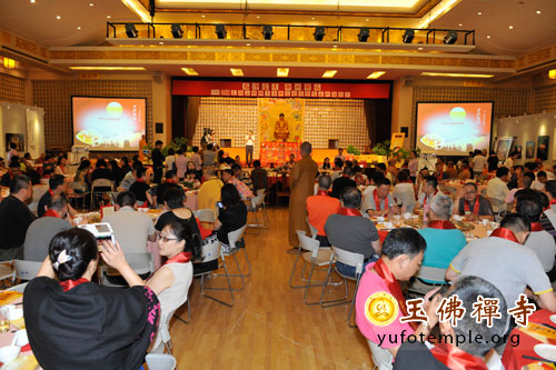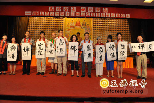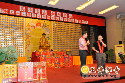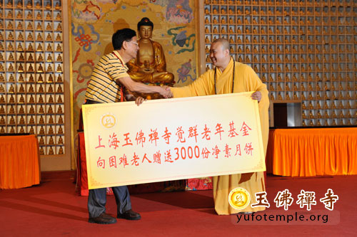 今天同时也是玉佛禅寺月饼品尝会举行的日子。在新歌发布会后,“品净尝素,积功聚福——2014上海玉佛禅寺月饼品尝会暨慈善祈福仪式”在觉群楼多功能厅举行,来自上海各界的代表人士约200余人参加。玉佛寺梵乐团在品尝会上表演了自己创造的节目,与会文艺界的知名人士也上台即兴表演,为整个品尝会增添欢乐的气氛。会上,觉醒大和尚代表玉佛禅寺,延续往年的传统,向上海市老年基金会、上海市慈善基金会和上海市儿童福利院捐赠月饼4500余份。