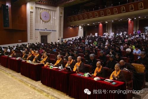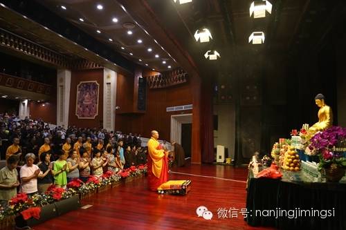 上午8点,鸡鸣寺的师父及居士信众400多人云集佛学讲堂,莲华法师在法会前勉励大众要利用这一个月的时间精进修学、福慧增长。随后,法会正式开始,莲华法师拈香主法,大众讽诵《大悲咒》,严净道场,并念佛至往生位前安位。