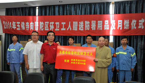 在慰问仪式上,长春法师等转达了觉醒大和尚对普陀区全体环卫战线工人夏日问候,高度赞扬了环卫工人起早摸黑、不分酷暑寒冬,日复一日、年复一年地工作在环卫第一线,辛苦我一个,整洁全市容。为感谢区环卫工人的辛勤工作,玉佛禅寺向公司的环卫工人送去了300份夏日慰问品,包括清凉花露水、沐浴露、毛巾、肥皂等防暑降温用品和今年新出炉的玉佛禅寺的净素月饼。