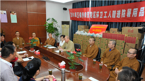 因受2014年第10号台风“麦德姆”的影响,申城连续几天的高温暂得缓解,上海玉佛禅寺继前天慰问普陀区公安交警之后,由寺务处主任长春法师代表上海市佛教协会会长、玉佛禅寺方丈觉醒大和尚来到普陀区新村路上海市普环实业有限公司一分公司,慰问在高温天气坚守岗位、为大家带来干净、整洁市容环境的环卫工人。