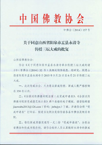 为秉承世尊遗教,光大如来戒法,绍隆佛种,续佛慧命,接引后学,荷担如来家业。经山西省宗教事务局、中国佛教协会([2014]157号)批准。由山西省佛教协会([2014]32号)主办、阳泉市盂县永清寺承办的传授三坛大戒法会。具体通告如下: