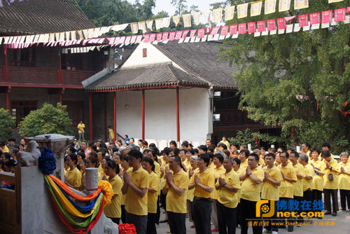“钟灵毓秀开盛筵,十朝故都放异彩。三宝加持护平安,中外同心促和谐。”2014年8月4日上午,来自南京全市各寺院的200多名法师、300多名居士齐聚南京栖霞古寺毗卢宝殿,为即将在南京隆重开幕的第二届夏季青年奥林匹克运动会举行盛大的祈福法会。