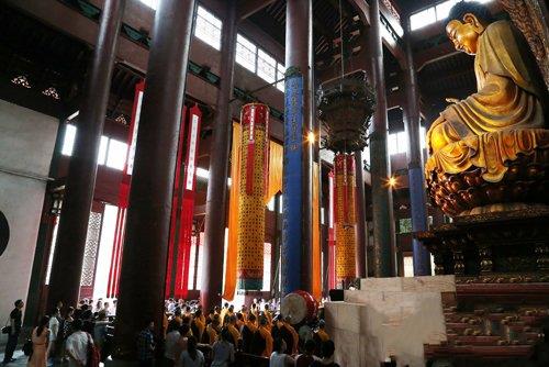 法鼓声声,钟鸣罄响。一袭黄色海青的法师们,来自天南地北的游客信众们,全都凝神合掌,举目凝视着殿内供奉的释迦牟尼佛,同声为共同的心愿祈祷。这里正在进行为云南地震灾区同胞祈福法会。