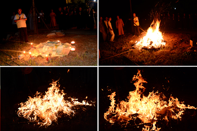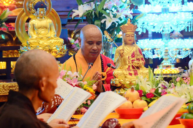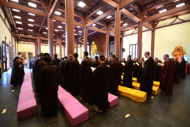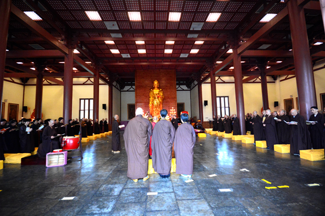 是日晚6点半,僧俗二众两百余人,齐聚念佛堂。念佛堂里法坛庄严,香花水果,供养诸佛菩萨。堂外两侧孤魂台上供有众生灵位。按照佛门传统仪轨,东林寺首座本通法师主法,大众诵经持咒,唱念佛菩萨名号,凭借三宝力量的加持,直示唯心法门,令群灵受持三皈,礼佛拜忏,闻法受食,同得解脱。两个半小时的法会,四众弟子真诚专注。法会在众人悲心切愿的回向声中圆满结束。