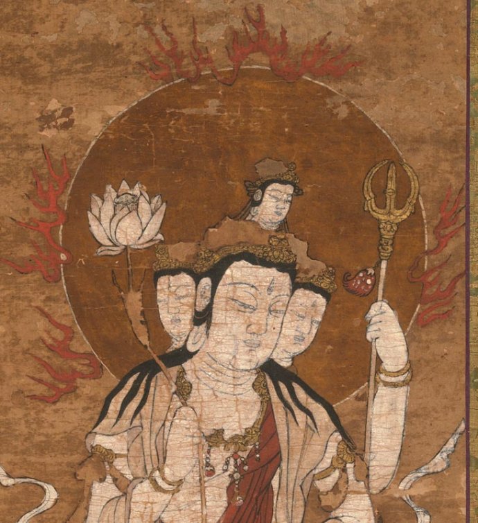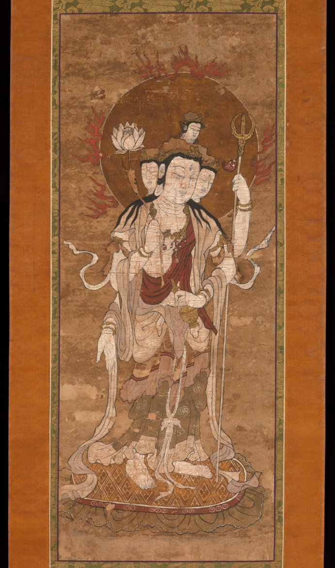 十四世纪 纸本设色 十四世纪 纸本设色 密教将大梵天王列为十二天之一,守护上方。此画为密教之四面四臂梵天像,头戴发髻冠,四面分双层排列,面相方正端庄,五官舒展秀美。身着天衣,佩戴耳珰、项圈、臂钏及手钏等饰品庄严全身。右手高举莲花、另一只右手施与愿印。左手持叉戟及军持(净瓶),披帛绕臂而下,与衣裙的下摆一同,在二侧飞舞飘扬,使赤足立于莲花法座之上的梵天有腾云飘逸之感。 保护、维持正法的意思。传说佛陀派请四大声闻、十六阿罗汉等护持佛法。 又梵天、帝释天、四天王、十二神将、二十八部众等善神听闻佛陀说法后,皆誓愿护持佛法,此等诸神总称为护法神,或称护法善神。 此外,人世间的帝王及诸檀越,都是保护佛法的人,亦称之为护法。所以今日的佛教界,对于虔敬三宝,护持佛教的在家居士,都以护法称之。