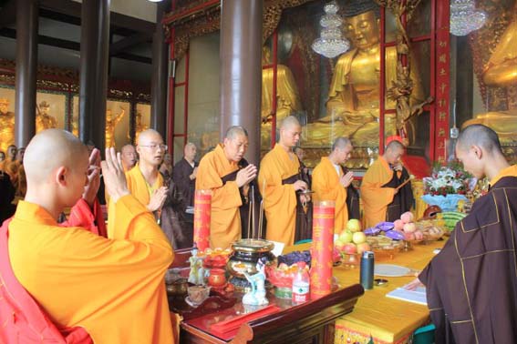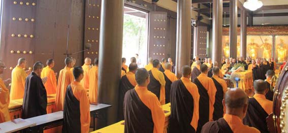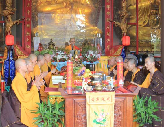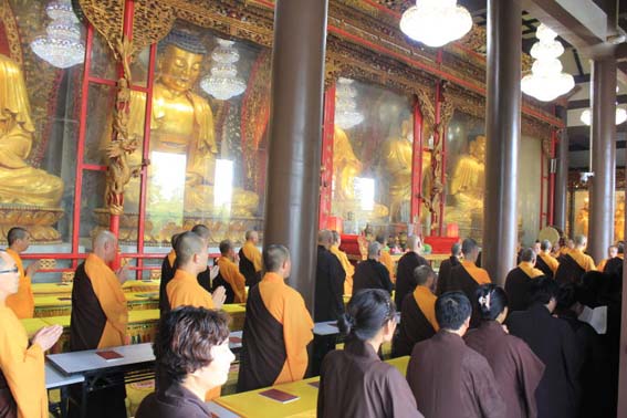 2014年8月3日8:30 法门寺性空法师带领本寺全体僧众在大雄宝殿举行隆重的中峰三时系念法会。参加法会的还有专程从西安赶过来的几十名余名居士信众,“三时系念”是净土法门殊胜的行持之一,最早由元朝的中峰国师所提倡,其目的是规劝我们,依净土念佛的修持而得度,同时也依弥陀之愿,劝导亡者往生西方极乐世界,永离茫茫业海与轮回之苦,是生亡两利的佛事。