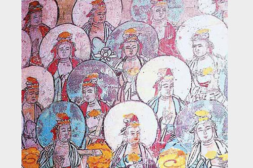 五台山现存壁画也有很多,计有8个朝代的2380.0l平方米。其中,保存较好的有佛光寺东大殿的唐代佛菩萨壁画61.68平方米、佛光寺东大殿宋宣和四年(1122)的7个佛光壁画2幅、岩山寺文殊殿的金大定七年(1167)壁画97.98平方米、南禅寺西配殿的元代壁画24平方米、佛光寺文殊殿的明代五百罗汉壁画l01.35平方米、公主寺大佛殿的明代壁画98.99平方米、南山极乐寺大殿明代绘的佛本行经变84幅、佑国寺明代佛本行经变117幅、三圣寺大殿明代壁画122平方米、虒阳岭村大王庙清代关羽故事壁画15幅、国都殿村清代关羽壁画15幅、龙泉寺文殊殿民国年间绘的五百罗汉过江壁画和白云寺大雄宝殿1999年所绘五百罗汉壁画2幅。下面介绍五台山最好的4处壁画之一的佛光寺东大殿唐代壁画。
