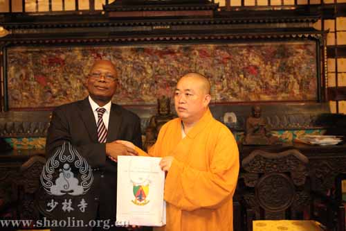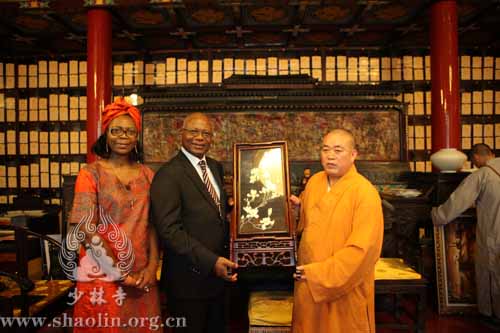 2014年8月10日下午,喀麦隆驻华大使马丁·姆巴纳(Martin Mpana)及其夫人索兰格·姆巴纳(Mpana Bofia Daka)一行参访禅宗祖庭少林寺,受到释永信方丈的热情接待。