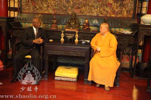永信方丈对马丁·姆巴纳大使的到来表示欢迎,并向大使介绍了“非洲少林功夫学员班”的情况,希望非洲的朋友们能经常到少林寺参访交流,促进中非人民之间的友好往来。