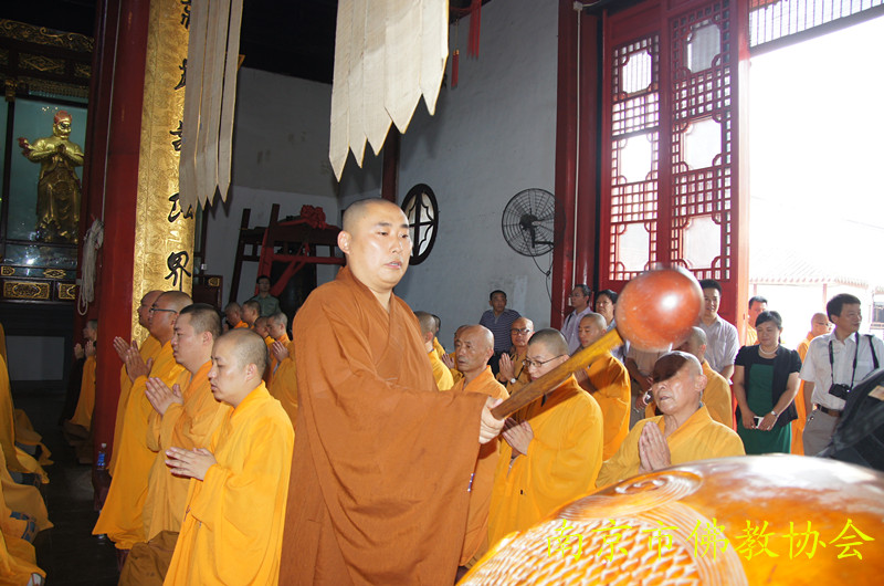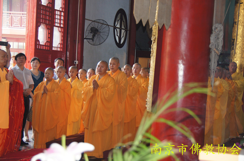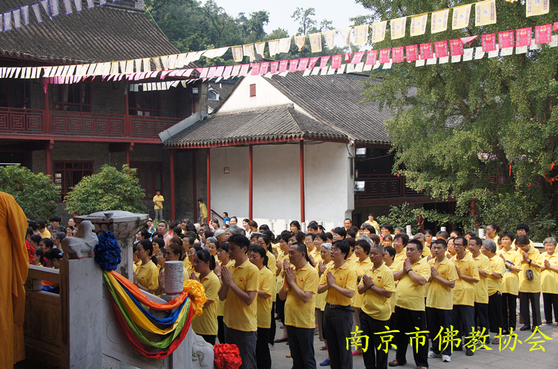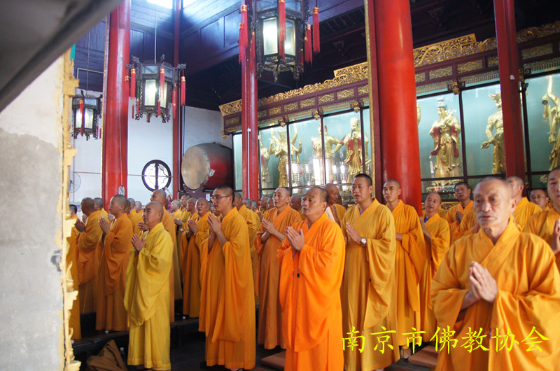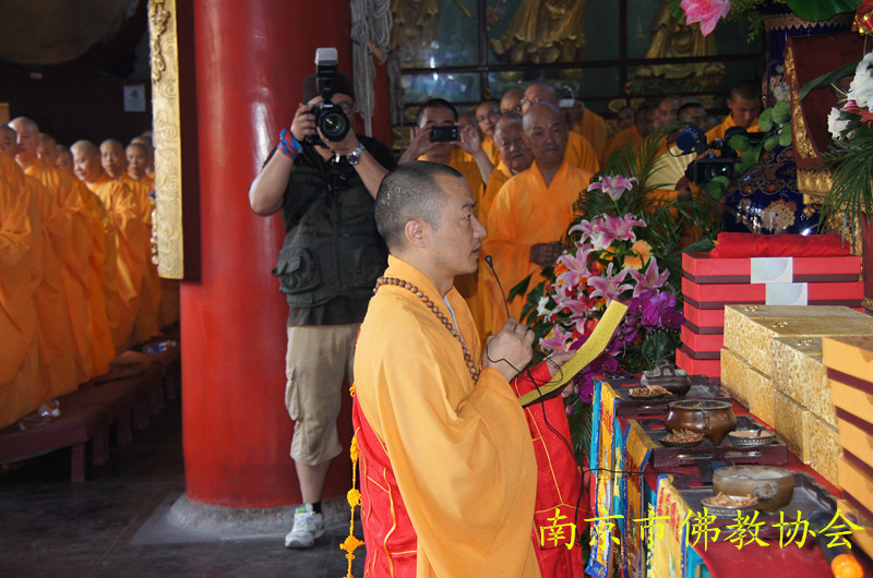祈福法会由江苏省佛教协会副会长、南京市佛教协会会长、栖霞寺方丈隆相法师、江苏省佛教协会副会长大初法师、江苏省佛教协会副会长、南京市佛教协会副会长、毗卢寺方丈传义法师、江苏省佛教协会副秘书长、南京市佛教协会副会长、灵谷寺方丈传静法师、南京市佛教协会副会长、惠济寺住持朗明法师、南京市佛教协会副会长、清凉寺住持理海法师、南京市佛教协会副会长、定林寺住持心融法师、南京市佛教协会副会长、真如禅寺住持果海法师、南京市佛教协会副秘书长、栖霞寺监院谛如法师共同拈香主法,为青奥盛会祈福,为来自世界各地的青年体育健儿加油助威,传静法师更是以一曲彻天动地的文疏宣诵,尽情展现了南京佛教四众弟子对于青奥的热爱和当代中国人民喜迎青奥盛会的热情饱满的精神风貌。