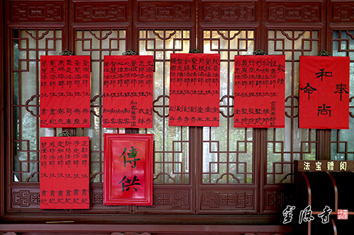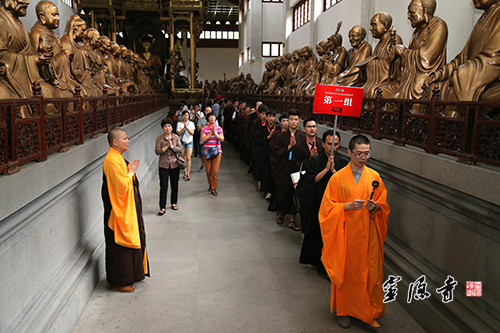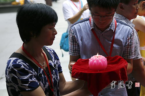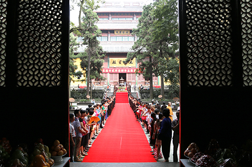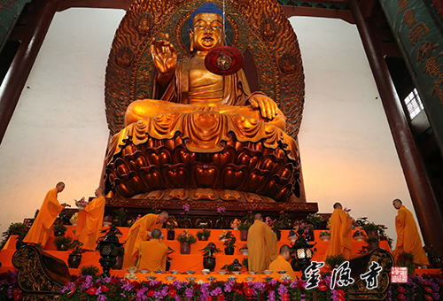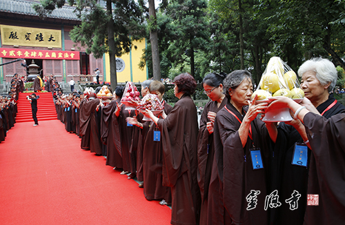 长长的传供队伍列为两队,从大雄宝殿开始,一直排到天王殿前。穿着僧衣的法师,披着海青的居士,随喜的善信,共同参加了传供法会。在声声诵念“南无本师释迦牟尼佛”圣号声中,香花果品,百味饮食,香油锭烛,尽世甘美,一应供养器物,从僧俗弟子一双双手中传递,最后虔诚呈供到鲜花布满的佛前。