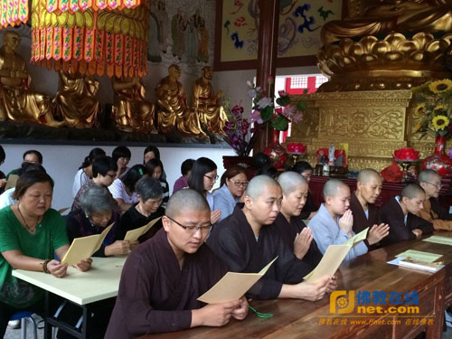 上午9时,盂兰盆法会正式开始。万源寺两序大众云集大雄宝殿,来自安徽、山东等地的居士50余人参加了这一因缘殊胜的法会。