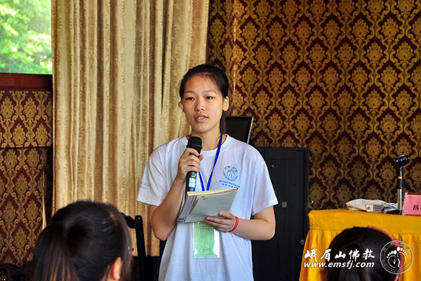 营员代表张子莹在发言中,感恩峨眉山佛教协会及峨眉山佛学院、大佛禅院举办这次禅修营给大家提供这个学习、体验佛文化的机会。她说,在七天的学习中,大家将走近古刹、聆听佛法,不求大彻大悟,只求与佛结缘,学会何为“清净、和谐、践行”,并让这七天成为一生中最美好的回忆。