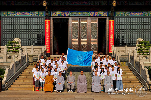 随后,满霖法师向营员代表授营旗,宣布“行愿峨眉夏令营”开营,并在大雄宝殿前合影留念。