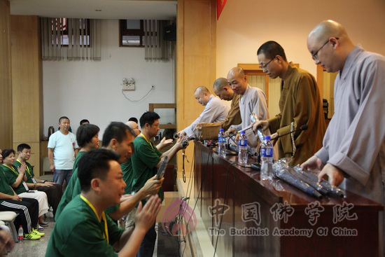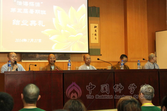 7月27日下午,第五期“法海探源”佛教文化之旅活动举行了结业典礼,容通法师、法广法师、海轮法师、传静法师等参加了结业式。结业式上,各位法师一一作了开示,勉励学员们再接再厉,不要辜负佛学院诸多法师的悉心教导,要不断的努力修学。学员代表发言,感恩此次活动的主办方中国佛学院、感恩授课法师的精彩开示、感恩‘法海探源"义工的辛勤付出。期间,法师们代表中国佛学院向学员们赠送了礼品。结业典礼之后,学员们献上了一台精彩的感恩文艺演出。