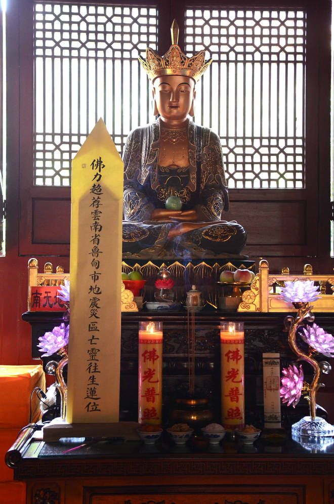 8月7日下午,近百位东林寺僧众在大雄宝殿为云南鲁甸地震灾区举行了超荐祈福法会,法师们诵读《阿弥陀经》、《大悲咒》、《往生咒》,称念弥陀圣号,对震中遇难的同胞表示沉痛的哀悼,祈请诸佛菩萨慈悲加被,使亡灵安息、往生净土,伤者早日康复,灾区民众能够顺利渡过难关,重建家园,恢复正常的生活。