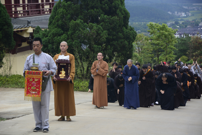 了尘大和尚首先对整齐列队的缁白二众开示:我们到净土宗第一道场来是参学的,应珍惜难得的因缘,以至诚恭敬心,顶礼东林大佛,忏悔自己的业障,发起往生极乐成佛度生的大心。大和尚要求大家在礼佛的过程中,不论是雷雨交加,还是烈日当空,都要放下对身体的执着,专心一意,礼敬弥陀。