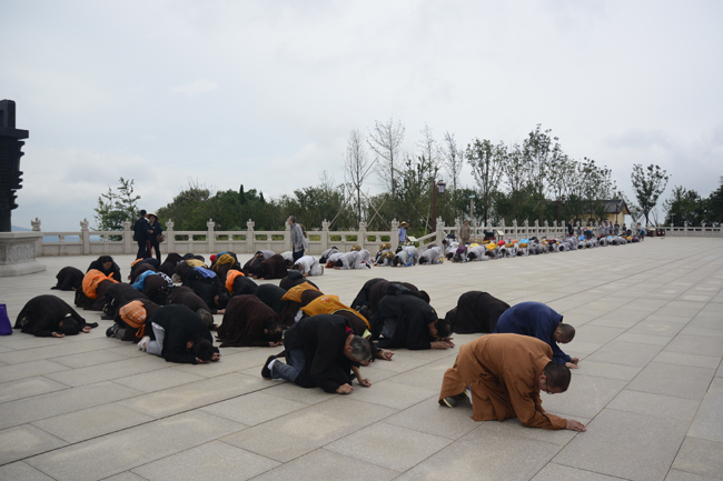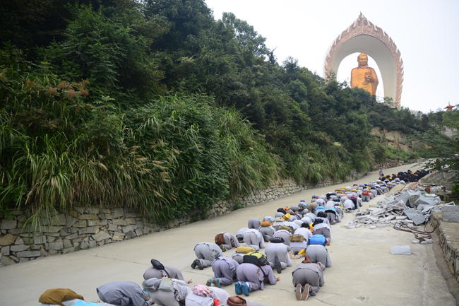 手托香盘、手捧佛像 在了尘大和尚的引领下 开始三步一拜至大佛台