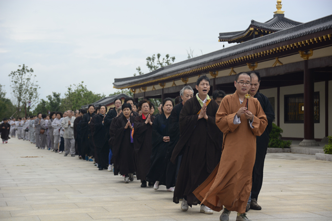随后,在手捧佛像、手托香盘的法师、居士引领下,大和尚高声念着佛号,缁白二众四人一排,三步一拜至大佛台。绕佛一匝后,在阿弥陀佛圣像前发愿、回向。