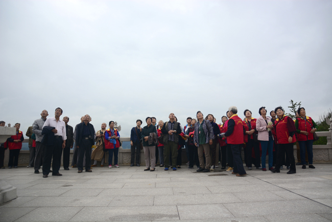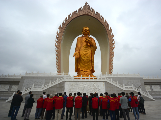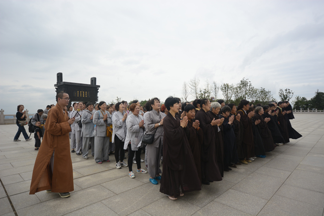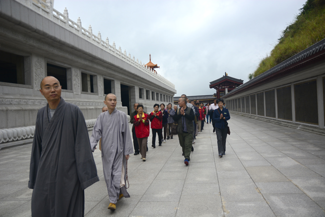 客人们先在拜佛台参观、礼佛、合影留念,然后步行至大佛台。在大佛台上,大家认真聆听了讲解人员对东林大佛及净土苑的介绍,随后参观了圣众来迎图和十二光如来的浮雕。大众由衷地赞叹、欢喜。道证法师带领大家绕佛一周,然后在阿弥陀佛圣像前庄严回向,圆满此次东林大佛参访之旅。