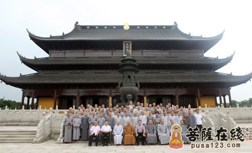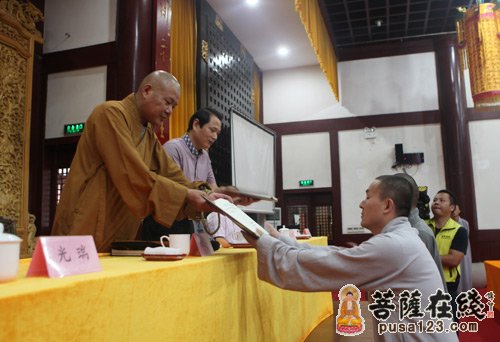最后,由主席台上的领导给寒山书院上学期的优秀学生颁奖,在悠扬、庄严的《三宝歌》声中,寒山书院2014秋季开学典礼圆满结束。全体人员在重元寺大雄宝殿前合影留念。