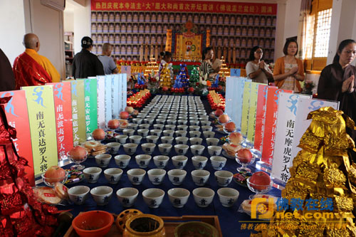 此次是首次在目莲寺举行的药师茶供,茶供坛城非常庄严,以药师经如法分置善名称吉祥王如来、宝月智严光音自在王如来、金色宝光妙行成就如来、无忧最胜吉祥如来、法海雷音如来、法海胜慧游戏神通如来、药师琉璃光如来。