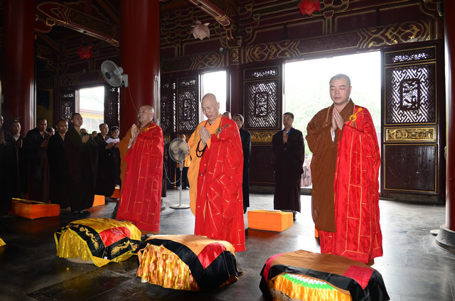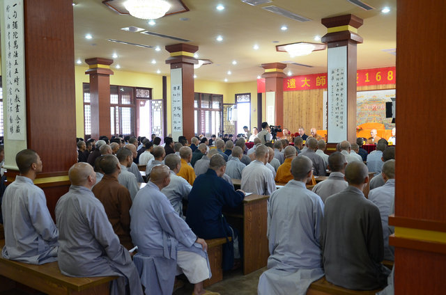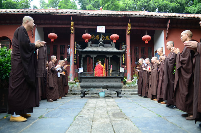 开幕仪式之后,东林寺举行了庄严隆重的“慧远大师诞辰1680周年纪念法会”。法会在大雄宝殿举行,由大安大和尚、弘法大和尚和慈满大和尚共同主法。下午两点,东林寺首座本通法师率僧众前往慧远大师塔院扫塔追祖并作法事活动。