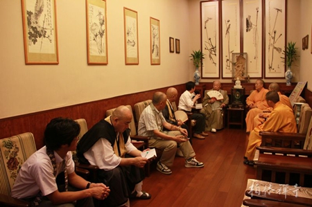 明海法师陪同长老参拜祖师塔并到万佛楼诵经礼佛。之后,明海法师与岭兴岳长老一行在方丈寮客厅会谈。会谈中,岭兴岳长老一行深情回顾了与柏林禅寺和净慧长老多年来的友谊,并表达了对净慧长老的深切怀念与敬佩。