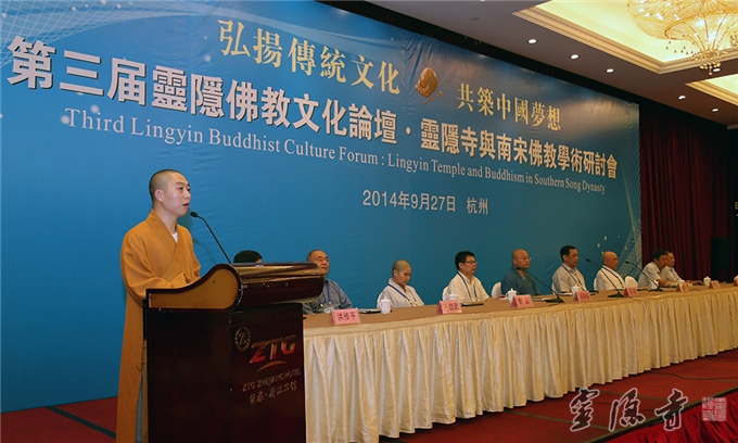 “灵隐文化论坛”由灵隐寺主办,迄今已满三届,是集教界、学界等各方面力量,发掘灵隐寺佛教历史文化,服务当前灵隐寺和杭州佛教文化发展的文化盛事。本次文化论坛以“弘扬传统文化,共筑中国梦想”为主题,以“灵隐寺与南宋佛教”为主要内容,为期两天,将于9月28日下午闭幕。