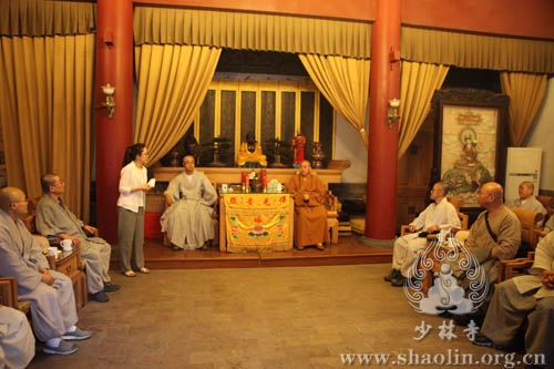 在少林寺客堂,永信法师向觉愚法师一行介绍了少林寺在过去、当前以及未来的发展情况,并介绍了少林僧众简单且传统的生活方式、僧才的培养以及少林寺在国际上所开展的文化交流活动。觉愚法师对少林寺在历史上的影响力,以及目前在国际上所取得的成果赞叹不已。