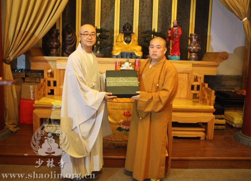 之后,永信法师向觉愚法师赠送了菩提达摩像,觉愚法师向永信法师赠送了书籍等礼物。在少林寺藏经阁门前,永信法师与觉愚法师一行愉快合影。