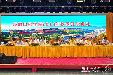 2014年9月15日,四川乐山峨眉山佛学院在大佛禅院峨眉讲堂举行了隆重的秋季开学典礼。中国佛教协会副会长、四川省佛教协会会长、峨眉山佛学院院长永寿法师,中国佛学院副院长向学法师,四川省佛教协会和峨眉山佛教协会的副会长们等;清华大学哲学系教授圣凯法师,中国社会科学院世界宗教研究所魏道儒教授、黄夏年教授,南京大学中国思想家研究中心傅新毅教授等专家学者;峨眉山佛学院2014级本科班、预科班新生和2012级本科僧众班、尼众班学僧及全体教师出席了开学典礼。四川省民宗委副主任杨伯明,乐山市委统战部副部长雷建全,乐山市宗教局局长高鹏,以及峨眉山市、峨眉山景区宗教局有关部门领导莅临典礼并讲话。