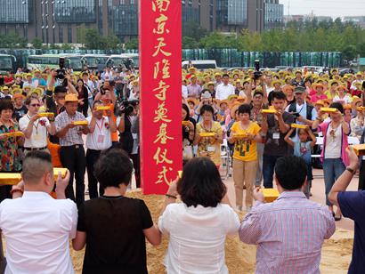 典礼当日,晴空万里,秋风送爽,由扬州鉴真图书馆青年高歌“朝山”“礼敬伟大佛陀”,以及南京小红花艺术团的鼓队表演揭开序幕;接着诸山长老依序入席,在全体大众齐诵《大悲咒》声中,由天隆寺住持隆相和尚及众法师熏坛洒净,并恭读星云大师为南京天隆寺奠基典礼所写的祈愿文。