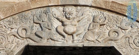 门券上方中央是一只大鹏,鸟身人面,嘴如鹰喙。这种形象是天龙八部之一的迦楼罗,汉译为金翅大鹏鸟。迦楼罗以龙(蛇)为食,身上臂上缠绕的似乎就是小蛇。这种大鹏在东南亚一带有着神圣的地位,泰国国徽上就是这种形象。