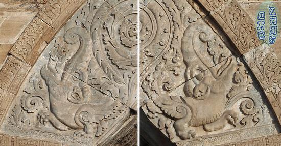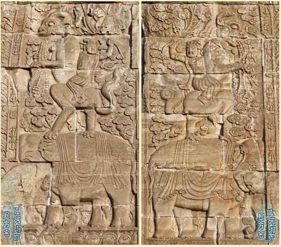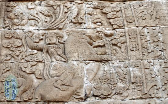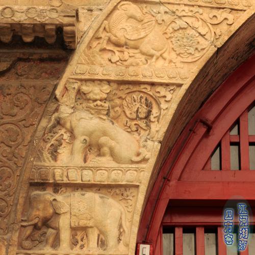 券门两侧是三者的巧妙组合。最下方是象王,背上站着一只怪兽,头上长着弯角略似山羊。怪兽背上骑坐着手拿花束的童子。