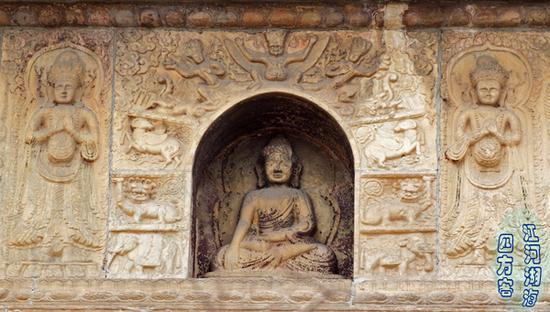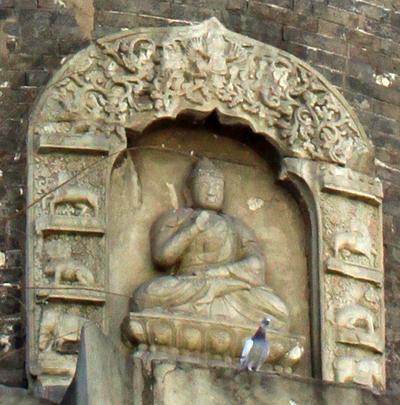 金刚宝座上的五座小塔,各自四面开券型佛龛。佛龛外面是同样形象的六拿具
