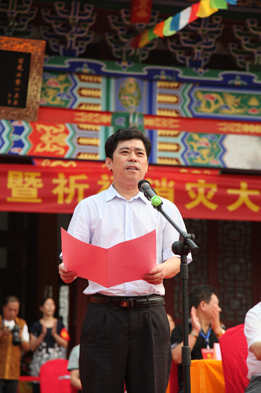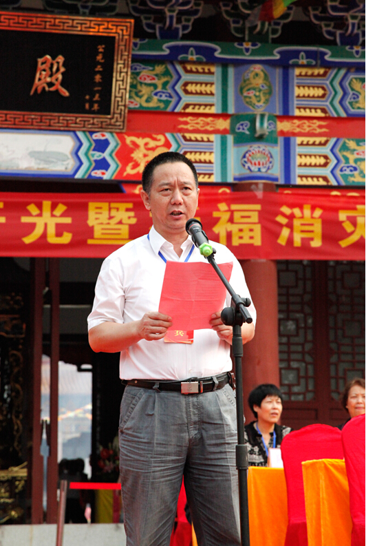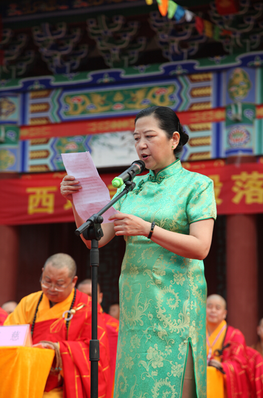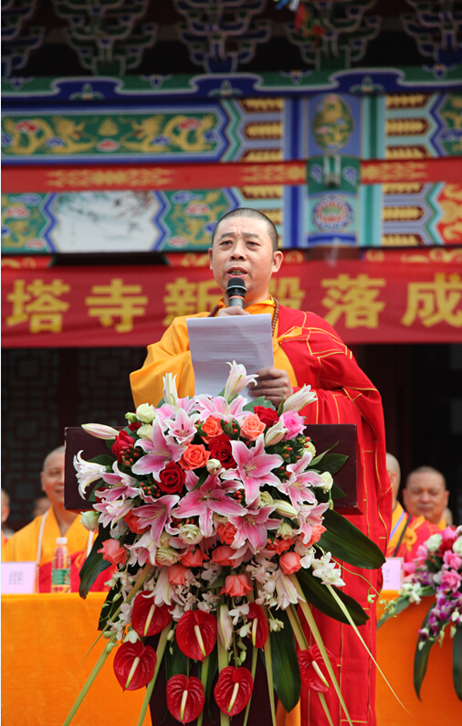 省民宗委副主任熊华启先生在会议上作重要讲话,他首先对天门市西塔寺住持心平法师的弘法事业给予了充分肯定,他指出西塔寺自2007年重建以来,在社会各界的关心支持下,在各位法师、信众的共同努力下,已初具规模。特别是近几年,我省开展“创建五好宗教活动场所”以来,西塔寺在心平法师的带领下,始终与党和政府同心同德,积极参加创建活动,不断提升了寺院管理水平,继承和弘扬了中国传统茶文化,为信教群众营造了一个环境优美、和谐和顺、健康向上的修行环境,为天门市的和谐社会建设做出了积极贡献。今天的西塔寺,殿宇宏伟,佛像庄严,环境优美,各方面管理已经走上正轨,为广大信众创建了良好的宗教活动场所。这一切凝聚了各级政府和领导的关心和指导,凝聚了诸山长老、各地寺院的帮助支持;凝聚了社会各界的大力资助;凝聚了心平法师和居士们的心血和汗水。今天我们在这里举行新殿落成、佛像开光庆典和奠基仪式暨祈福消灾法会,标志着西塔寺的建设和发展进入一个新阶段。