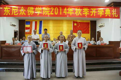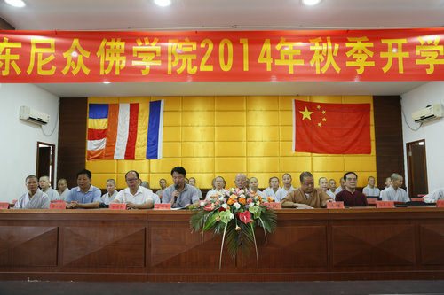 漫长的暑假一晃而过。迎着秋天的脚步,带着秋天的收获,我们又步入了一个新的学期,2014年9月13日上午,广东尼众佛学院2014年秋季开学典礼在学院法堂隆重举行。参加典礼的有定光寺方丈达宜大和尚、广东尼众佛学院院长达理法师、陆丰市民族宗教事务局局长曾志平先生、陆丰市民族宗教事务局副局长陈伟民 先生、广东尼众佛学院教务长振辉法师、本院护法居士郭丰杰先生以及全院师生。