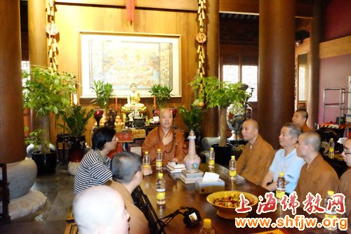 中观法师陪同上海佛学院师生依次参观龙华古寺,并在大雄宝殿集中礼佛。随后,佛学院师生们随中观法师来到华林丈室,参礼照诚大和尚,并欢喜座谈。