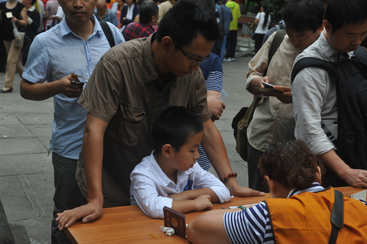 在近千人的队伍里,一个小朋友显得可爱又成熟。今年才六岁的妙优皈依了。他的父亲曾经是文殊院青年佛学会唯识班学员,于是母亲跟着父亲学佛,后来妙优又跟着妈妈学。这一家三口终于成了佛化家庭。妙优的妈妈说:“来皈依的原因主要是希望从小就给他一个心灵的家园。”